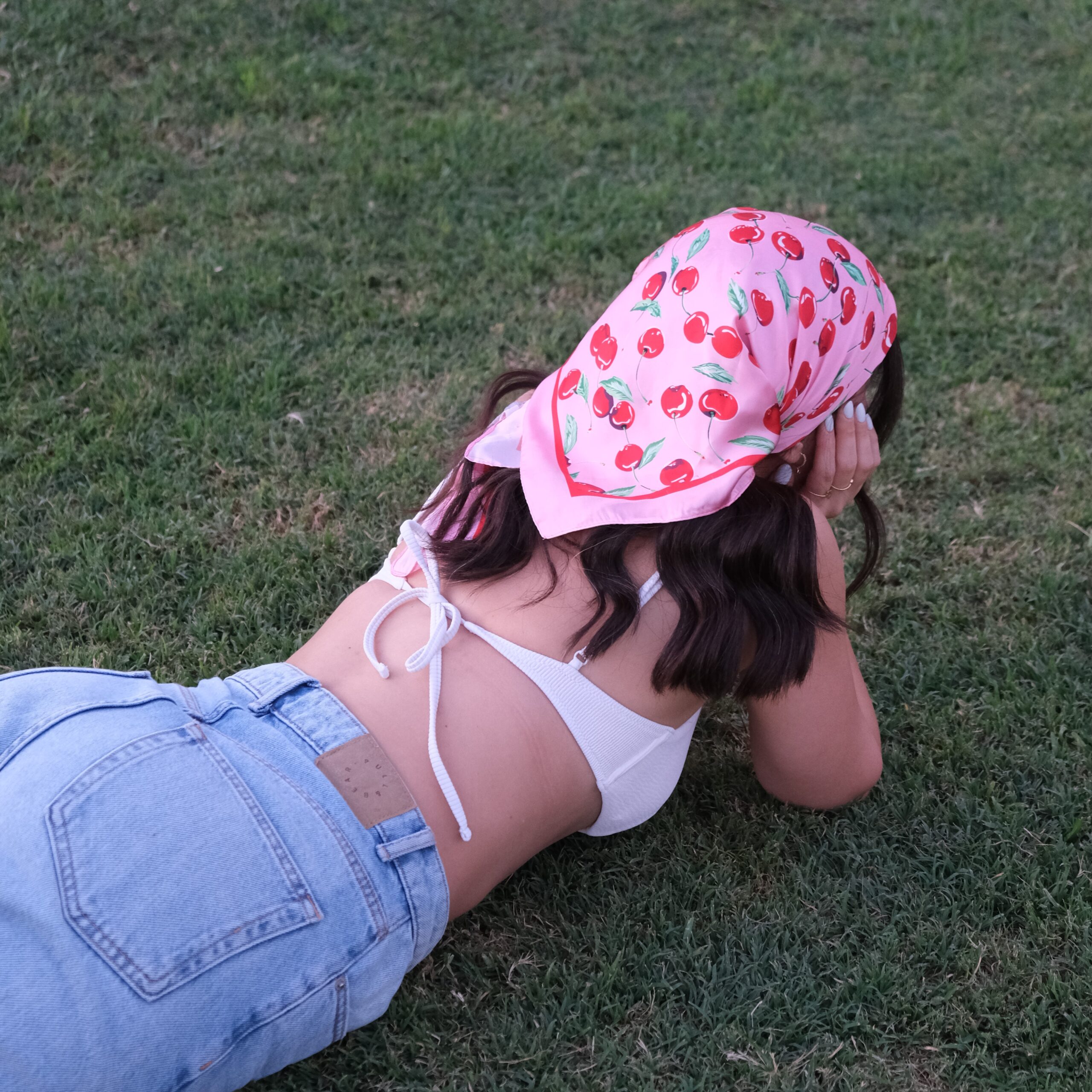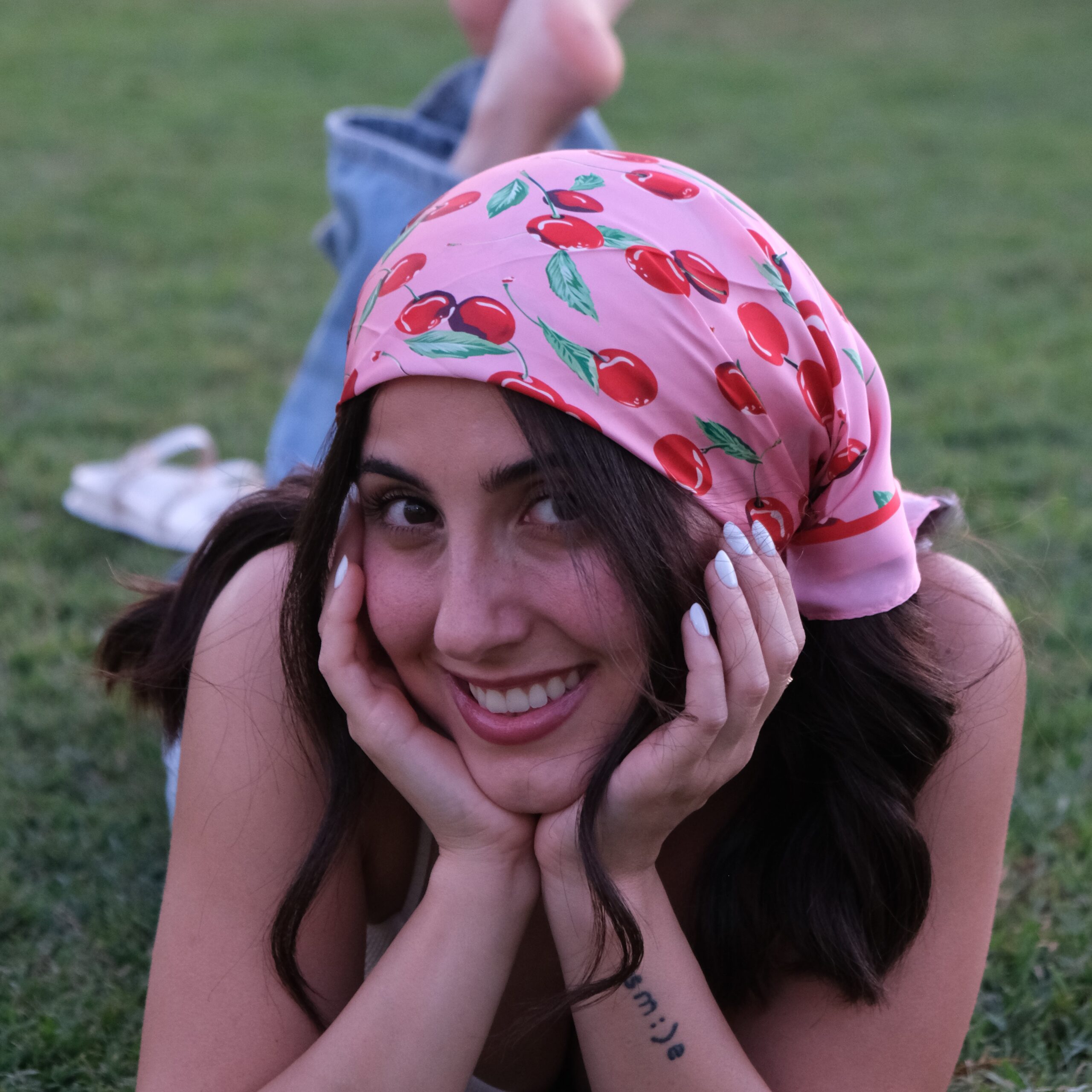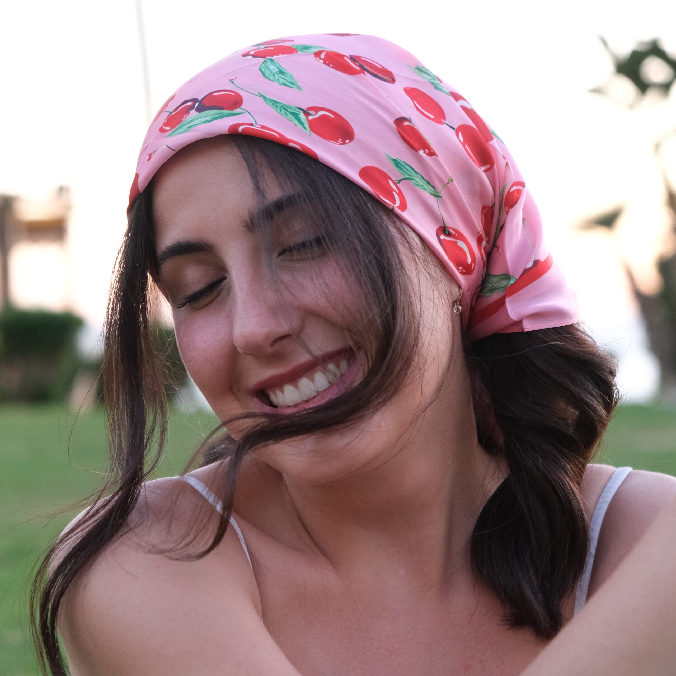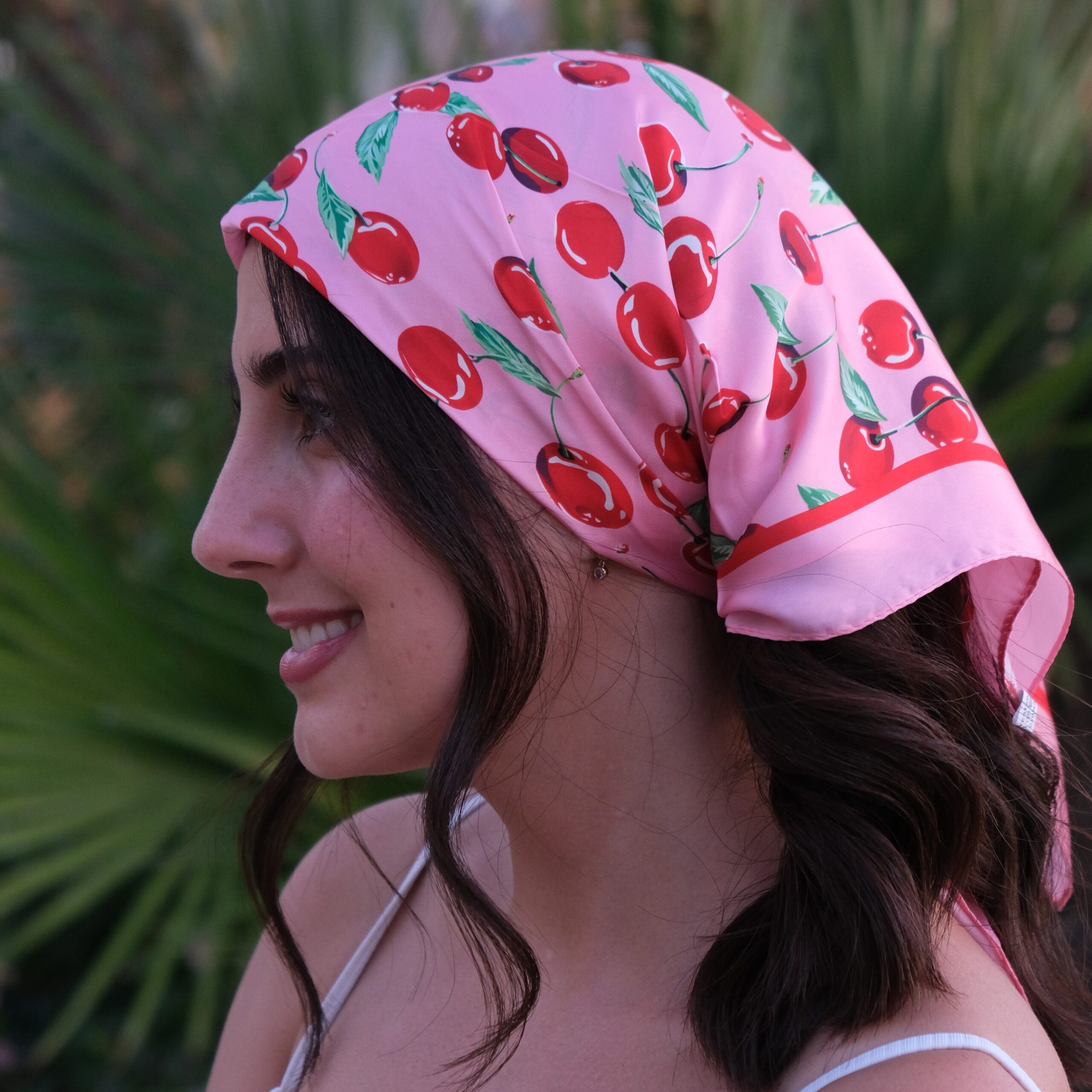 Fresh and fun, this silky pink scarf is printed with bold red cherries and green leaves. Soft and glossy, perfect for summer days, road trips, or picnic-ready looks.